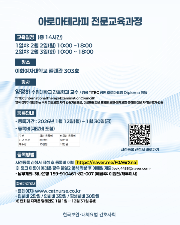 - [공문 2026-01] 2026년 한국보완대체요법 간호사회 전문교육과정아로마테라피개최안내.pdf (70.8K) 3회 다운로드 | DATE : 2026-01-15 11:07:18